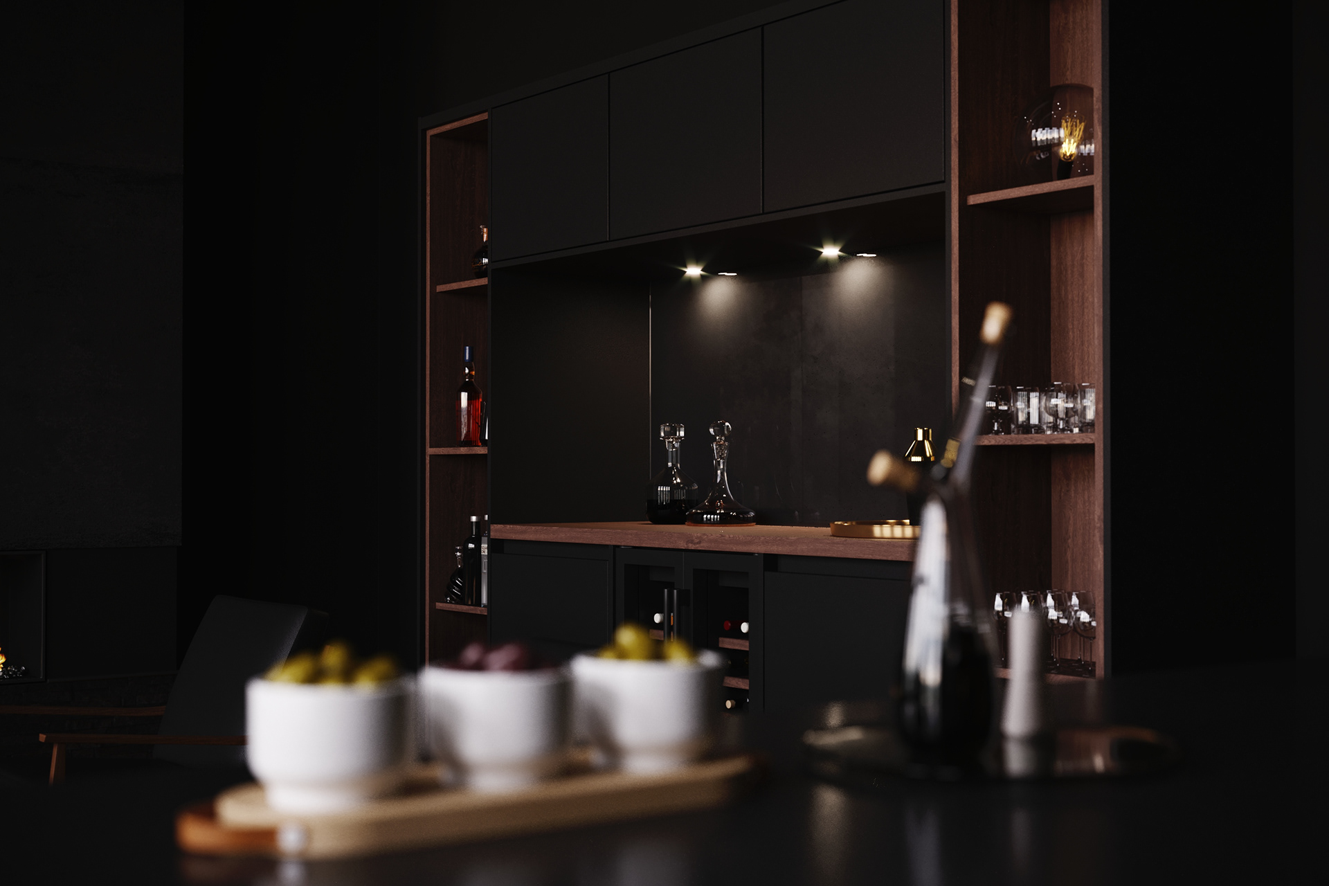 Commissioned project of a black space, a contemporary kitchen with a cozy living room.